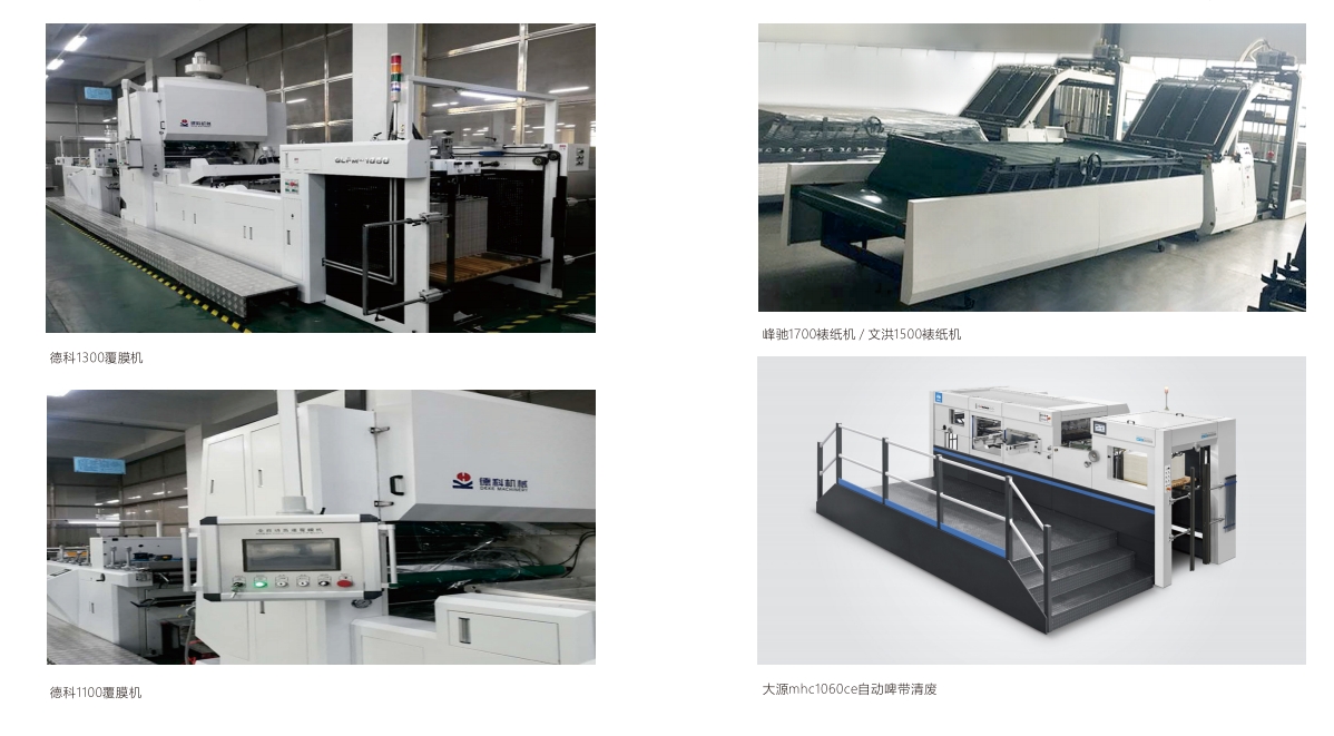 Forming equipment: Delco laminating machine, Laminating machine, Die-cutting machine, Hot stamping machine, Label printing machine
