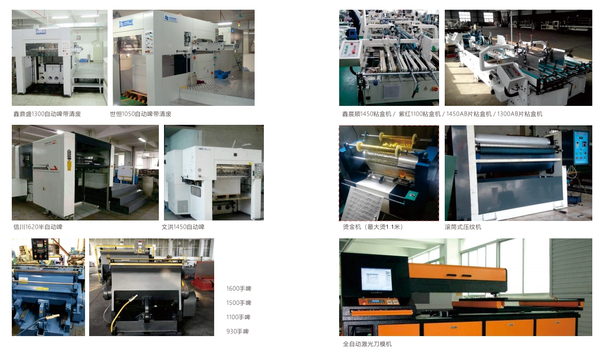 The company currently has advanced automated production equipment such as Fengchi 1700 laminating machine, Jiaohong 1500 laminating machine, Xinchenshun 1450 box gluing machine, 1450ab sheet box gluing machine, 1300ab sheet box gluing machine, Shideke 1100 glue pressing machine, knife mold machine, Delco 1300 glue pressing machine, etc., which has become a powerful guarantee to meet customers' on-time delivery.