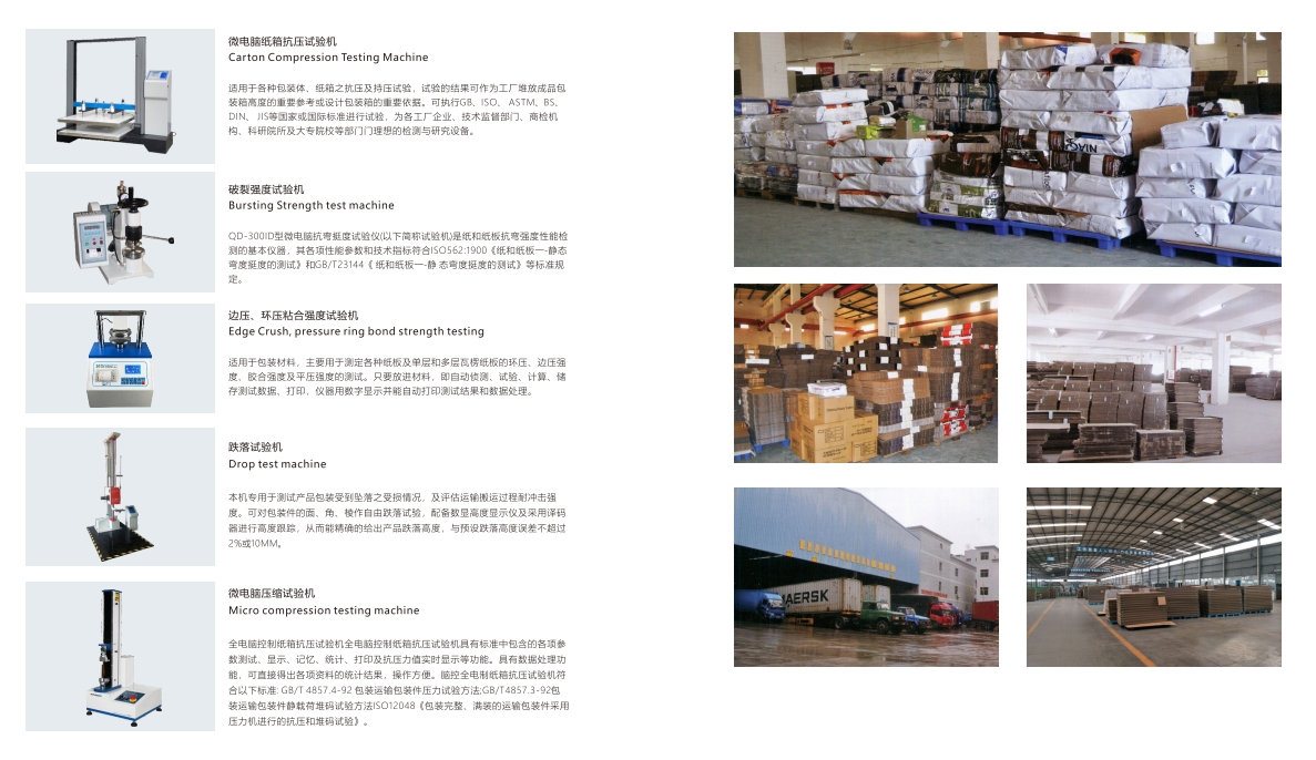 Testing equipment: Microcomputer cardboard compression testing machine, Rupture strength testing machine, Edge pressure, Ring pressure bonding strength testing machine, Drop testing machine, Microcomputer compression testing machine